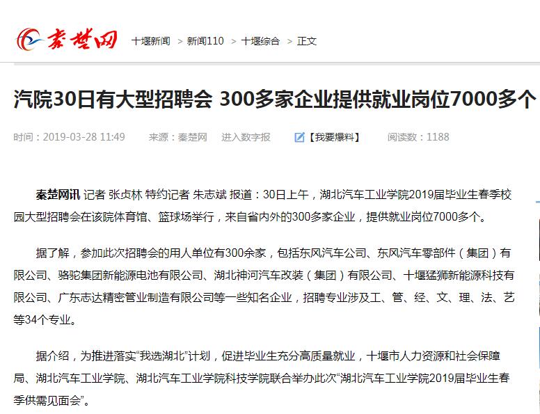 【秦楚网】汽院30日有大型招聘会 300多家企业提供就业岗位7000多个