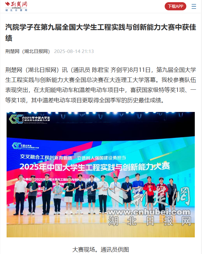 【荆楚网】汽院学子在第九届全国大学生工程实践与创新能力大赛中获佳绩